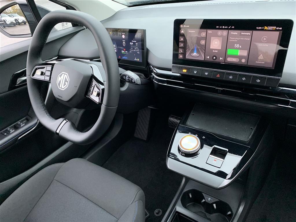 PTC Varmer, Adaptiv Fartpilot, 17" Alufælge m. Aero hjulkapsler, Touchskærm, Ratbetjent DAB radio, Apple CarPlay, Android Auto, Bluetooth, Håndfri mobiltelefon, Musikstreaming via Bluetooth, 4 højtalere, iSMART Lite (MG app-styring), Navigation, Bakkamera m. dynamisk guide, USB, USB C, 12V udtag, Auto Light Control, LED kørelys, LED forlygter, Intelligent styring af fjernlys, LED baglygter, LED tågebaglygter, Stofkabine, Højdejustérbart førersæde, Sædevarme, Armlæn, Kopholder, 60:40 splitbagsæde, 4-vejs mikrofiber læderrat m. varme, Automatisk klimaanlæg, Digital instrumentering, El-rudehejs for & bag, El-sidespejle m. varme, Drive Mode (Eco/Normal/Sport/Snow), One Pedal Drive, Parkeringssensor bag, Elektrisk håndbremse, Nøglefri betjening, Nøglefri lås, Nøglefri start, Fjernbetjent centrallås, Kørecomputer, Servo, Udvendig temperaturmåler, V2L (Vehicle to load - adapter skal tilkøbes), Solbrilleholder, Lys i bagagerum, Tonede ruder, Lavt placeret hækspoiler, Indfarvede kofangere, Bagrudevisker, Airbags, ABS, ESP, Isofix, Selealarm, Auto Hold, Kø-assistent, Aktiv vognbane-assistent, Vejbaneassistent, Antispin, Advarsel om usikker kørsel, Advarsel ved vognbaneskift, Hastighedsassistent, Skiltegenkendelse, Automatisk nødopkald, Automatisk dæktryksovervågning, Automatisk nødbremsesystem